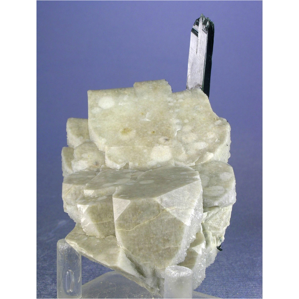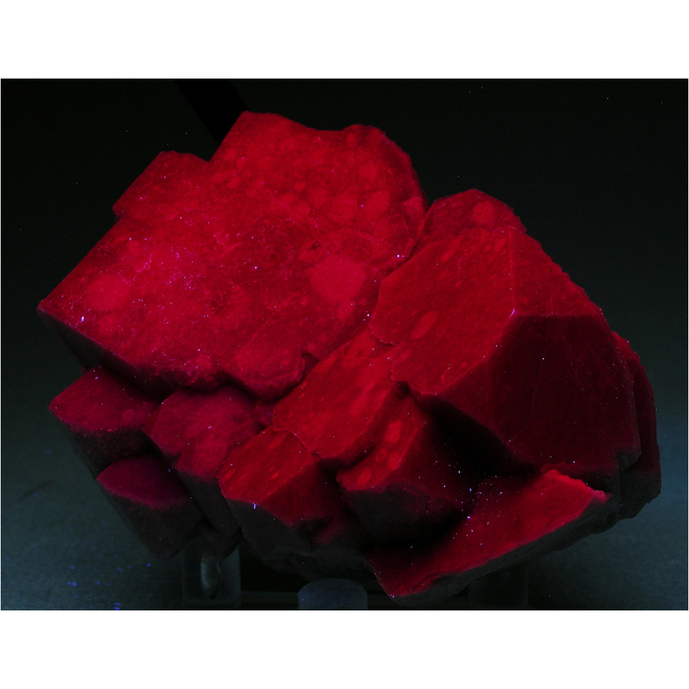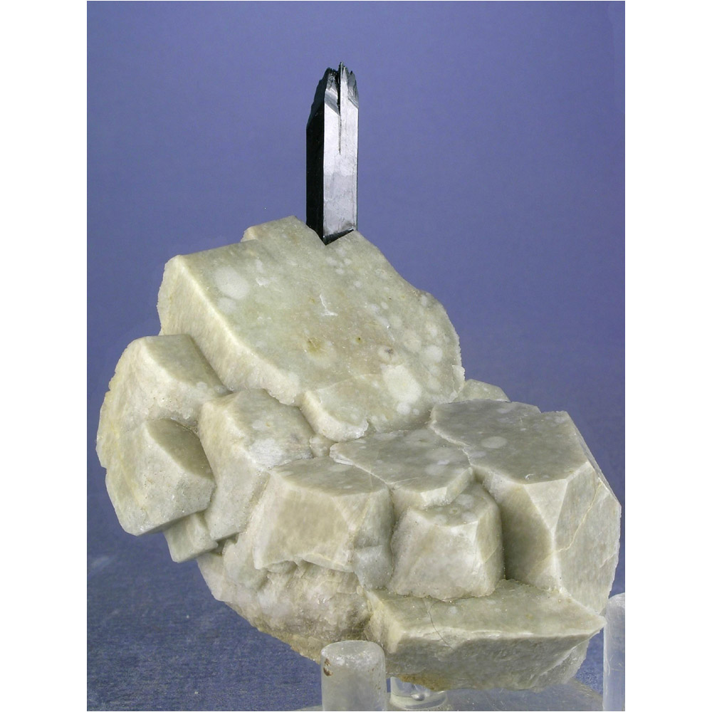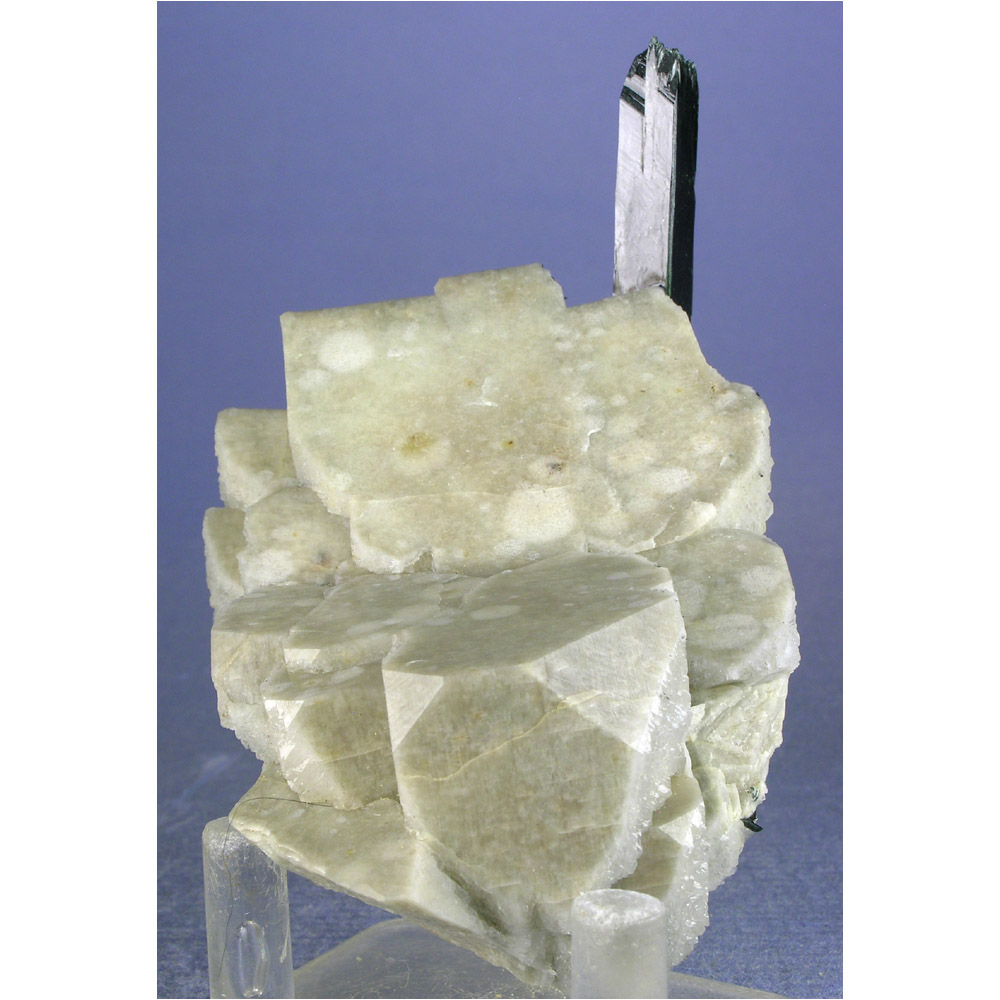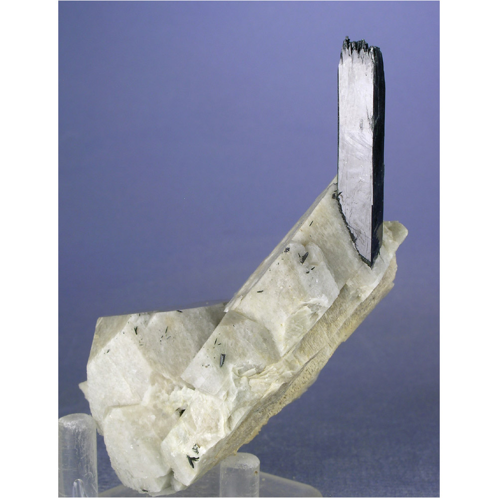 A very gracefully composed specimen of Aegirine with Feldspar from Malawi. It features a single terminated crystal of jet-black Aegerine artfully positioned over a nicely formed group of mottled, off-white Microcline crystals. The Microcline FLUORESCES a reddish-pink under shortwave UV light (see the next photo). Excellent display views all the way around this gracefully composed specimen. All in all, a very attractive cabinet-sized specimen and quite uncommon in this quality.