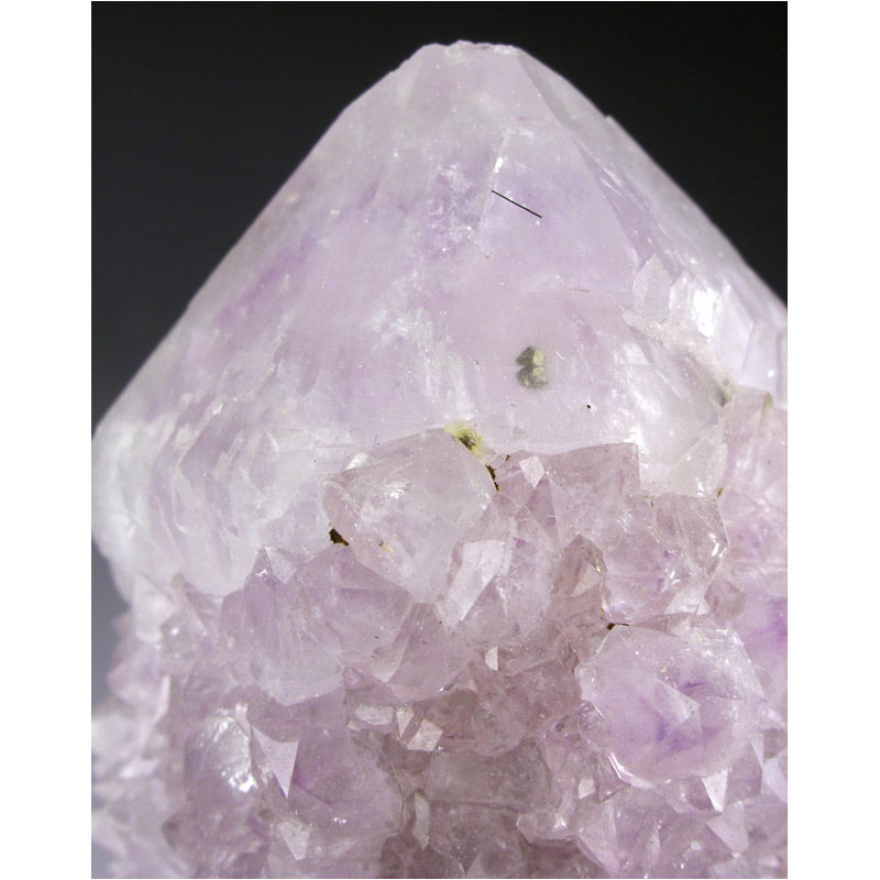 A very pretty specimen of nicely crystallized Amethyst in a formation often called Cactus Quartz or Spirit Quartz. This particular specimen is especially interesting due to the inclusion of two octahedral Pyrite crystals in its tip. Complete all the way around, with lots of fine details for you to explore.