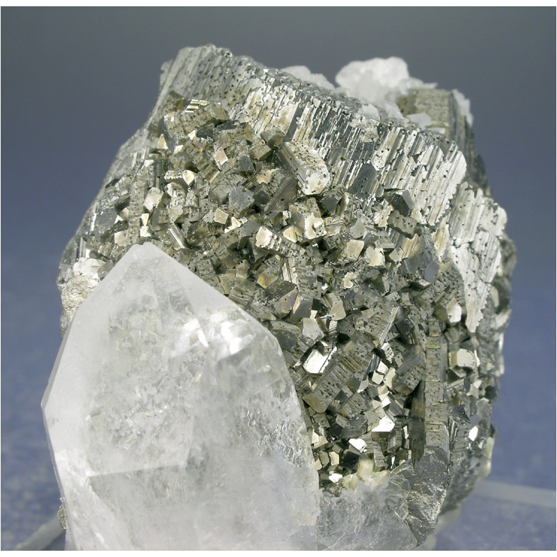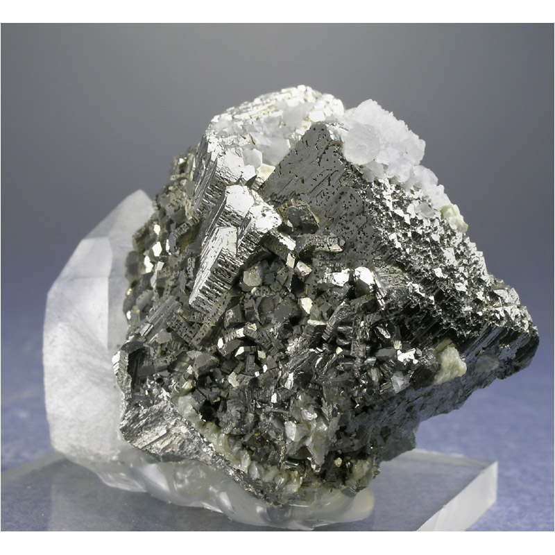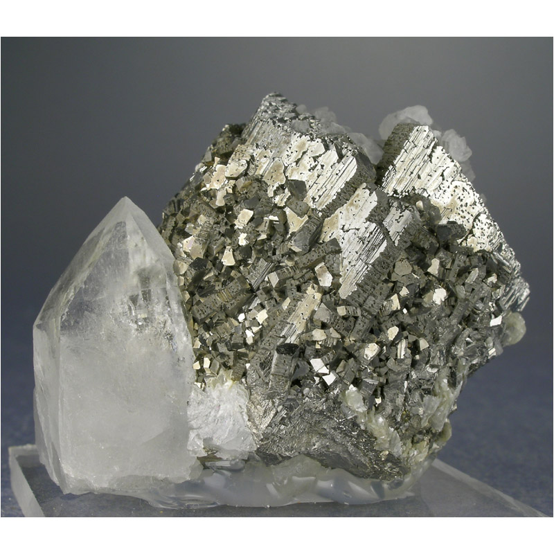 A gracefully composed and quite brilliant Arsenopyrite/Quartz crystal combo from the Yaogangxian Mine in Hunan, China. Complete all the way around and in excellent condition. Comes mounted to the clear acrylic stand pictured, which I can remove at your request if desired.