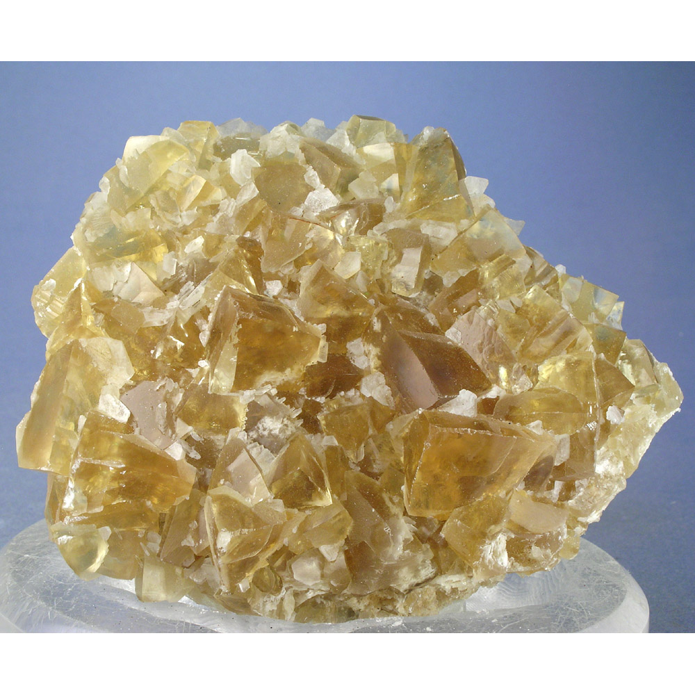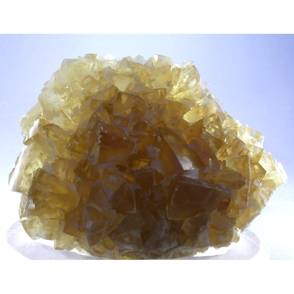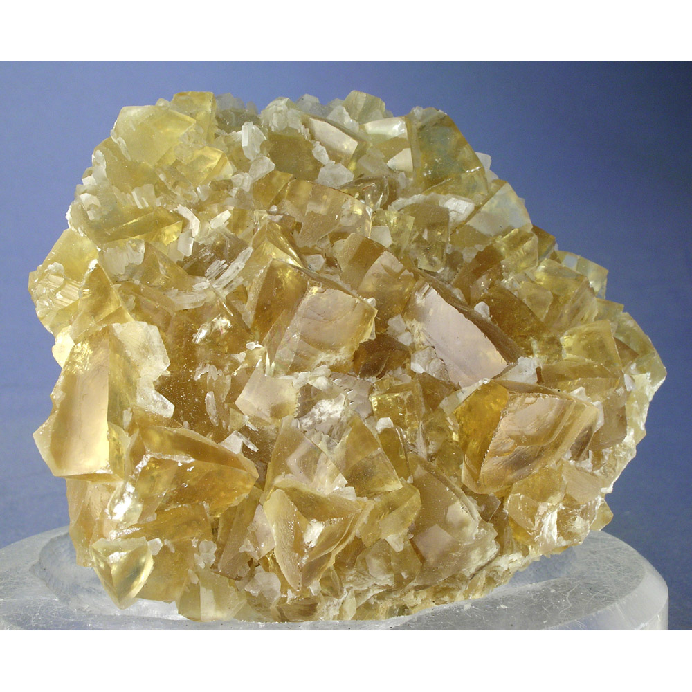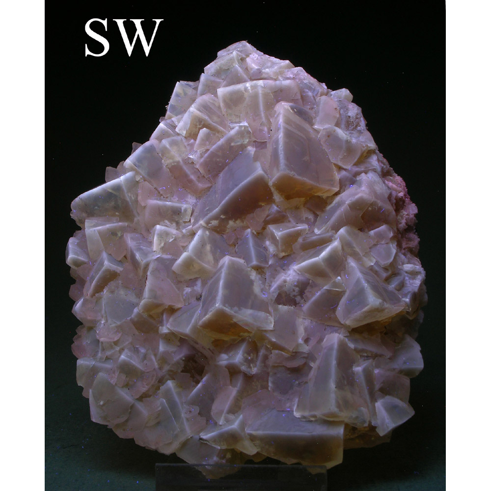 >A very colorful specimen from a recent find of gemmy Calcite from the Longyan mine in Fujian, China. It features numerous lustrous, bright canary-yellow Calcite rhombohedrons arranged into the nicely balanced composition pictured. The Calcite is strongly fluorescent, exhibiting different reactions to longwave and shortwave UV light (see below), and is also PHOSPHORESCENT under shortwave UV light. In excellent condition, and quite showy for display as shown.