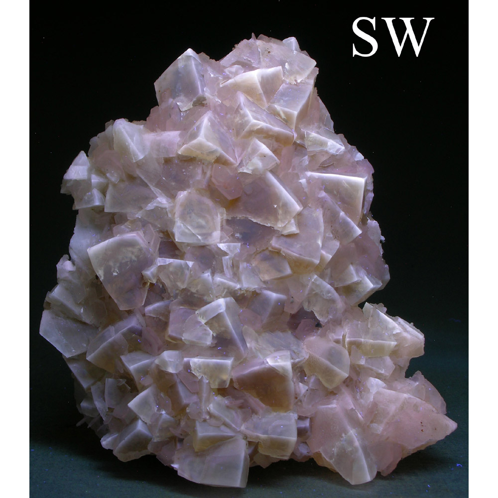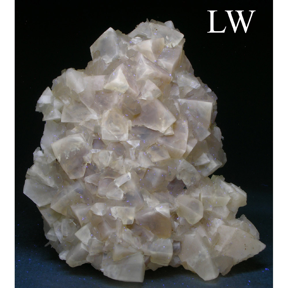 A very colorful SELF-STANDING specimen from a recent find of gemmy Calcite from the Longyan mine in Fujian, China. It features numerous lustrous, bright canary-yellow Calcite rhombohedrons arranged into the nicely balanced composition pictured. The Calcite is strongly fluorescent, exhibiting different reactions to longwave and shortwave UV light (see below), and is also PHOSPHORESCENT under shortwave UV light. In excellent condition, and quite showy for display as shown.