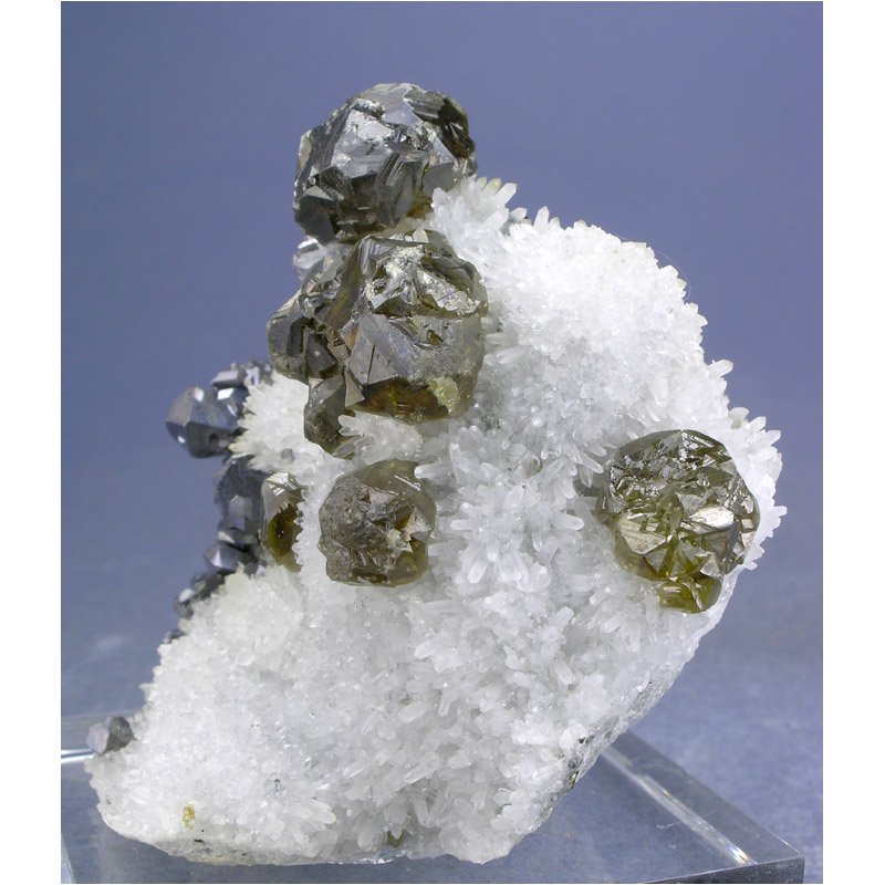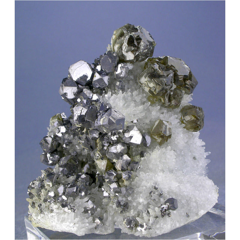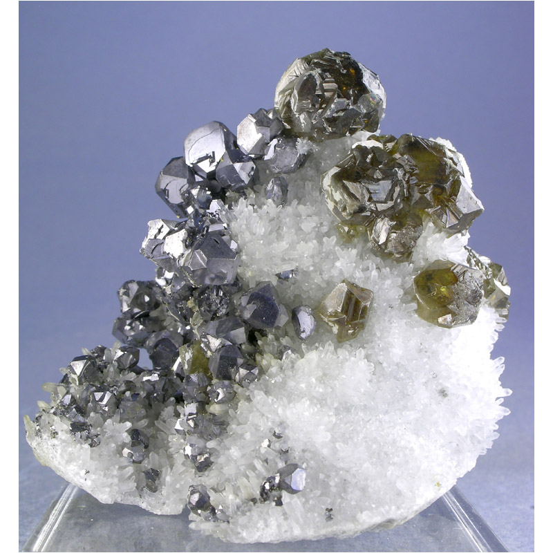 >A unique and beautiful specimen from the 2013 find of GEMMY Cleiophane Sphalerite in Bulgaria. It features a matrix of Quartz crystals which are hosting numerous very lustrous yellow-green crystals of the Cleiophane variety of Sphalerite and some nicely contrasting Galena crystals. All in all, a very gracefully balanced specimen, with excellent contrast and composition, and loads of interesting details for you to explore. In excellent condition as pictured. Comes mounted on the clear acrylic base pictured (I can remove this on request). From my personal collection.