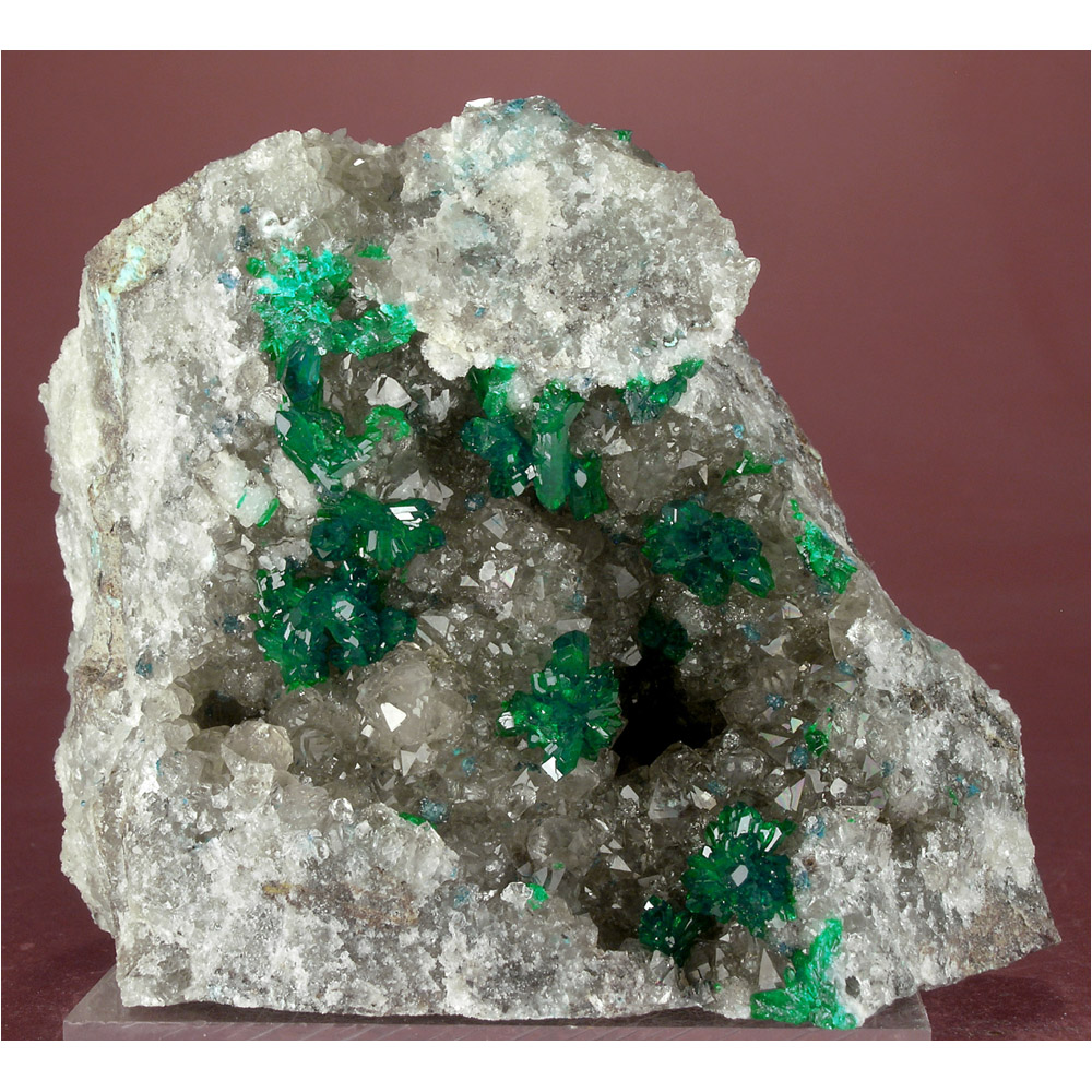 A large and quite striking specimen of GEMMY, intense green Dioptase crystals on matrix from the new finds at Mindouli in the Republic of the Congo (not D.R.C.). It features numerous crystals of lustrous Dioptase artfully arranged over a matrix of sparkly Quartz crystals. The matrix has been trimmed on the bottom and backside for optimum presentation.