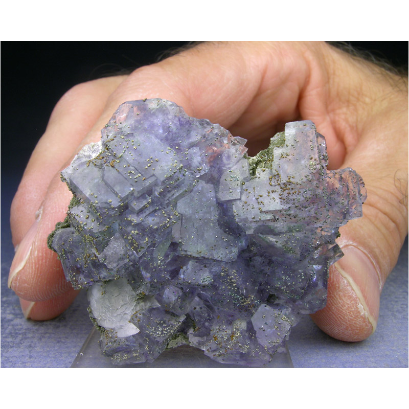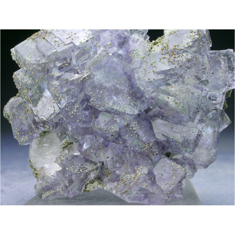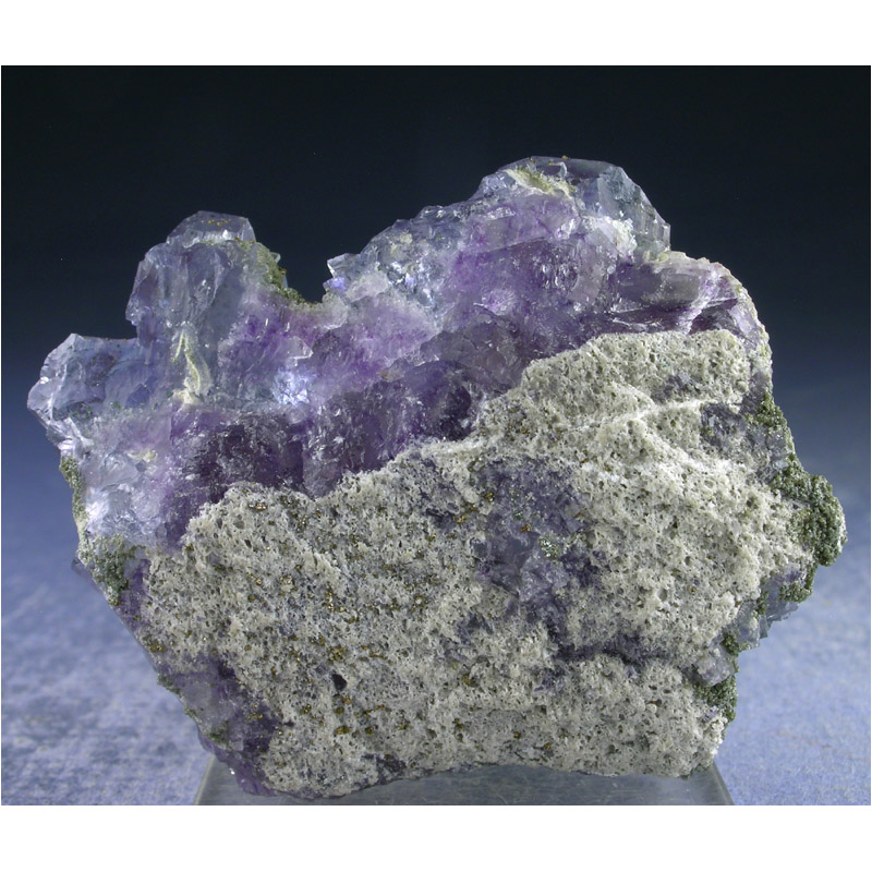 A choice 3-mineral combination from the Yaogangxian Mine in Hunan, China, mined around 2002. It features several crystals of gemmy purple Fluorite which is hosting numerous tiny balls of golden Pyrite and a single group of fluorescent poker-chip Calcite. Self-stands to present for display exactly as pictured. As the photos show there are lots of beautiful details for you to explore all over.