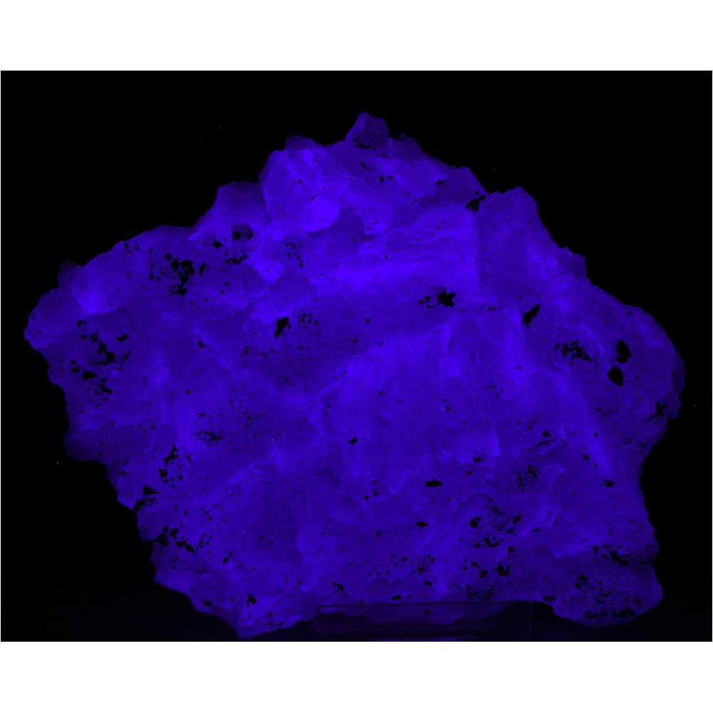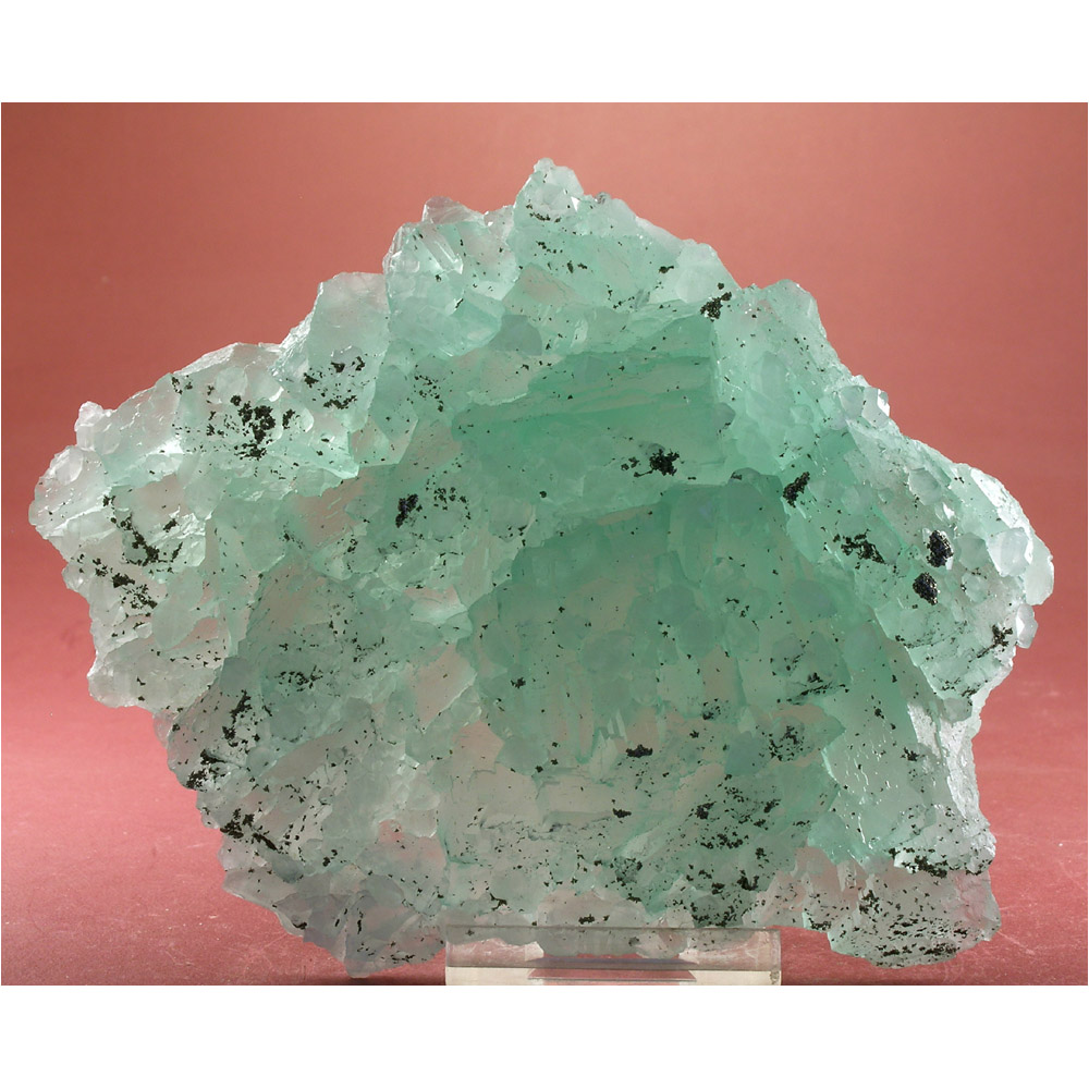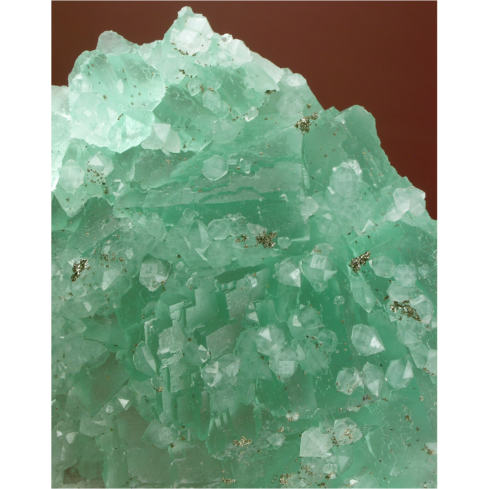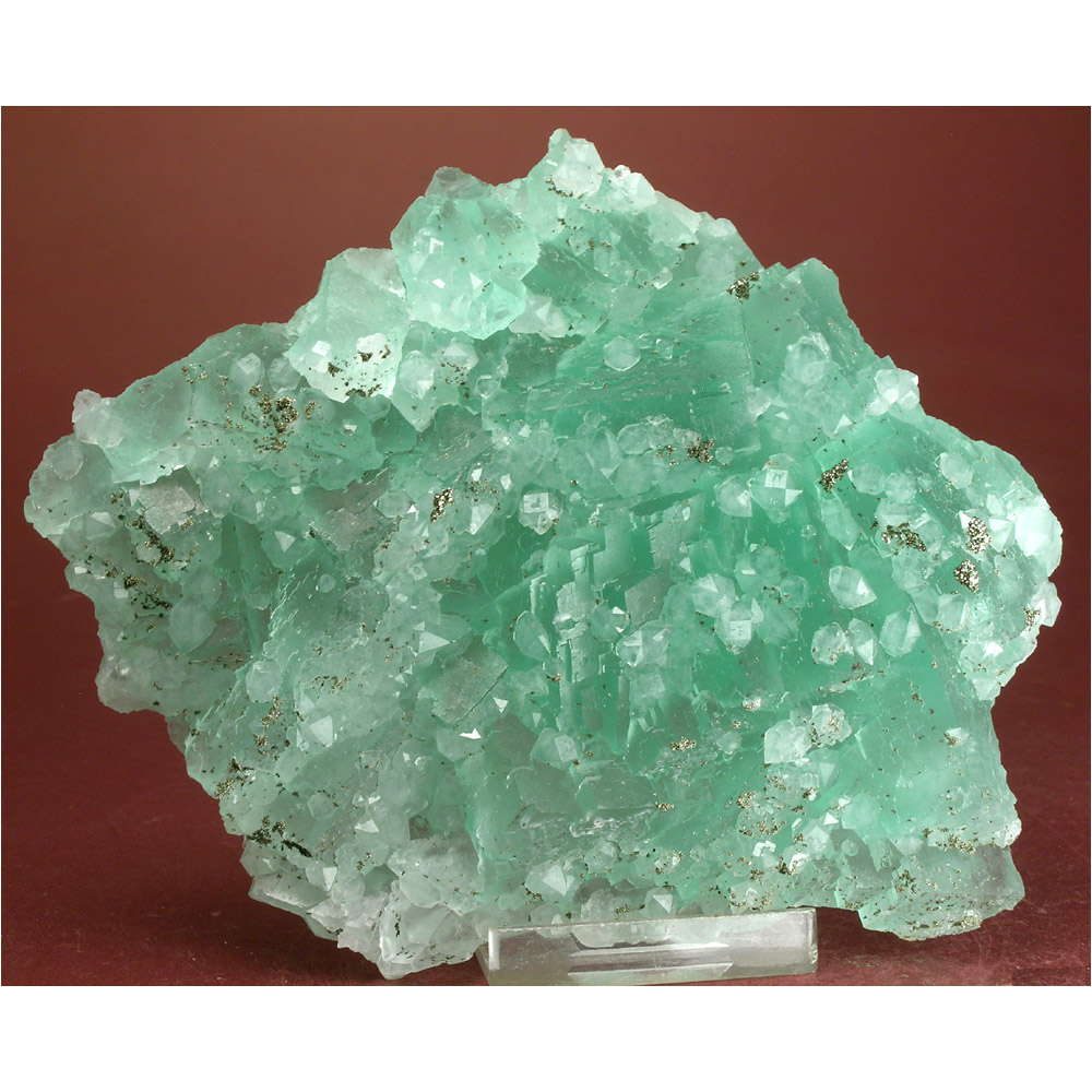 A large and quite colorful specimen of mint-green Fluorite crystals from El Hammam in Morocco. It features a large cluster of interjoined Fluorite cubes which are hosting numerous small Herkimer-like crystals of Quartz and a sprinkling of golden Pyrites. FLUORESCENT under longwave UV light (next photo).
