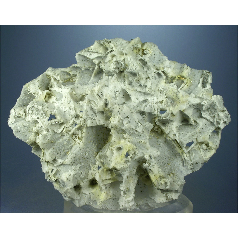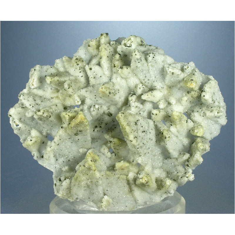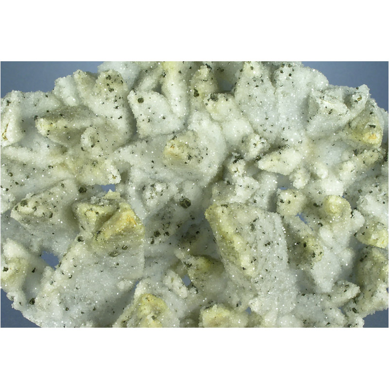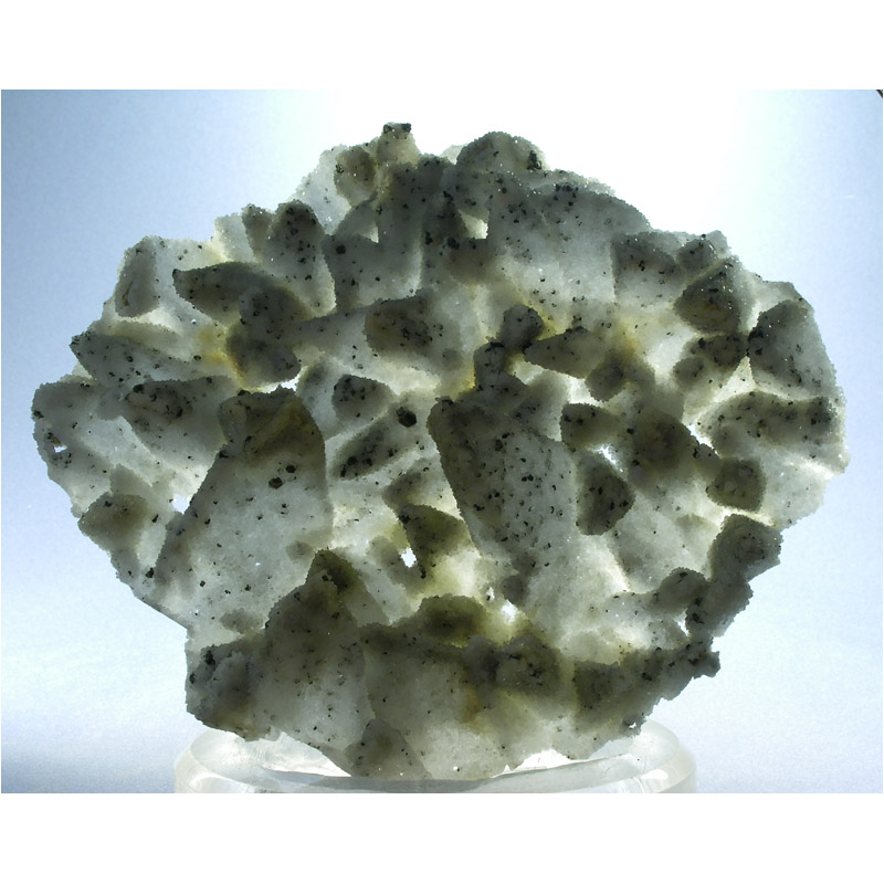 A unique and quite attractive large-cabinet specimen from the Boldut mine in Cavnic, Romania. It features an epimorph (cast) of Quartz crystals that were coating the surface of former Calcite crystals which have dissolved away while still in the Earth. The backside of this remarkable specimen exhibits the negative impressions of the now missing Calcite crystals, as seen below, and the surface of the Quartz casts are sprinkled with countless tiny crystals of Chalcopyrite. The specimen is extemely light (only 10 ounces) for its size. Loads of beautiful details for you to explore all over. Perfect presentation for display and in excellent condition. These mines are now permanently closed, so don't let this one disappear.