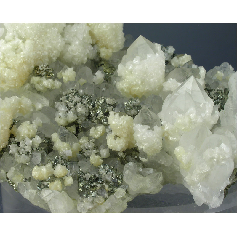A VERY showy large-cabinet specimen from the Boldut mine in Cavnic, Romania. It features well-crystallized examples of Quartz, Dolomite and Pyrite interjoined to form the glistening composition pictured. Loads of beautiful details for you to explore all over. Perfect presentation for display and in excellent condition. These mines are now permanently closed, so don't let this one disappear.