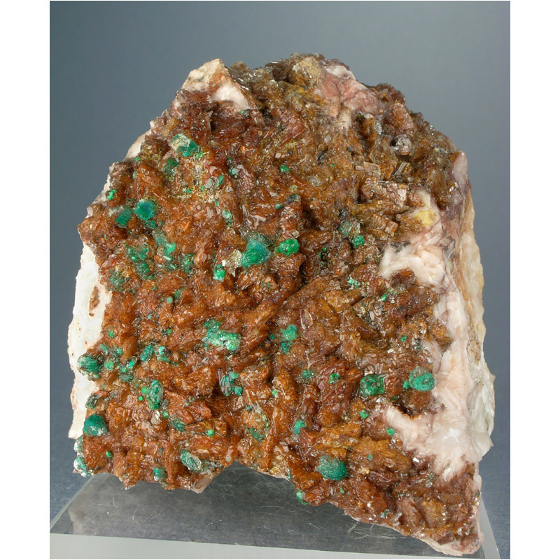 A very handsome and quite colorful specimen of Rosasite with Dolomite and Selenite from Morocco. It features a matrix of reddish-brown Ferroan Dolomite which is hosting numerous spherical groups of blue-green Rosasite crystals. There is a thin layer of clear Selenite crystals encasing some of the Rosasites and coating some of the Dolomite as well, creating a very sparkly effect and contrasting nicely against the rugged geography of the Dolomite. In excellent condition, with lots of fine details for you to explore all over.