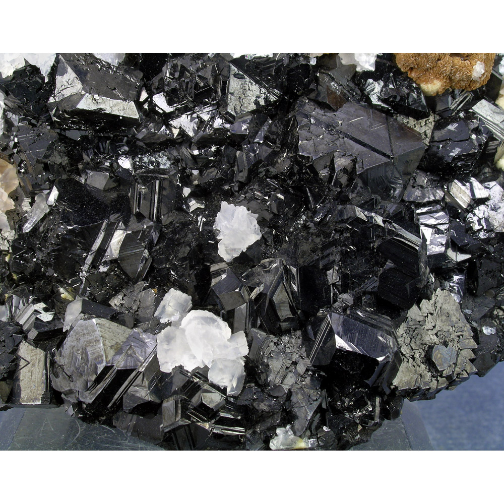 A sharp and shiny combination of Sphalerite with Calcite and Siderite from Trepca in Kosovo. It features a hand-sized cluster of shiny black Sphalerite crystals arranged into a gracefully balanced composition and accompanied by small groups of Siderite and Calcite crystals. In PRISTINE condition. The Calcite fluoresces a pleasing pink color under shortwave UV light (not shown). Loads of exquisite details to explore on both sides this brilliant beauty.
