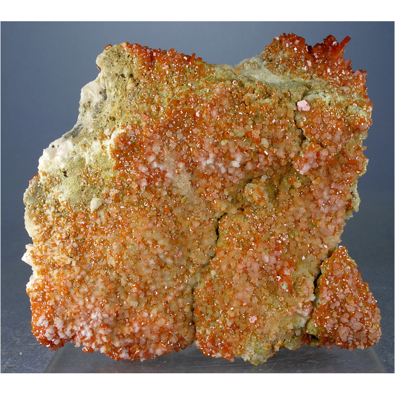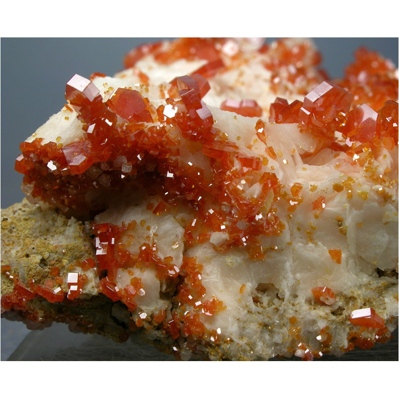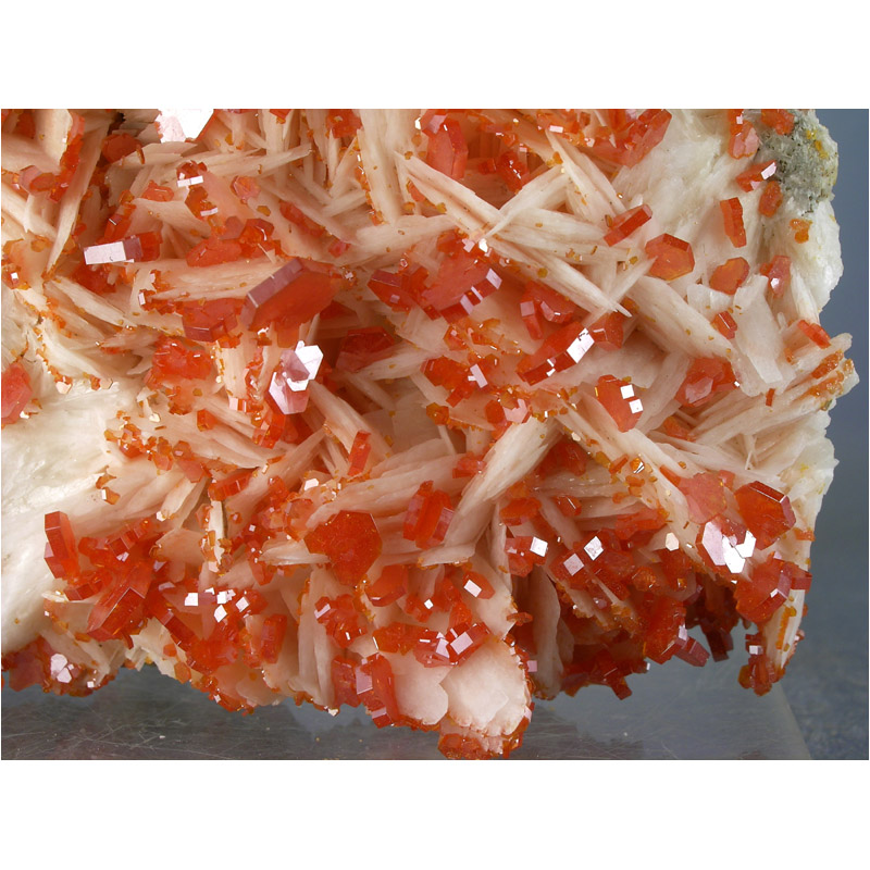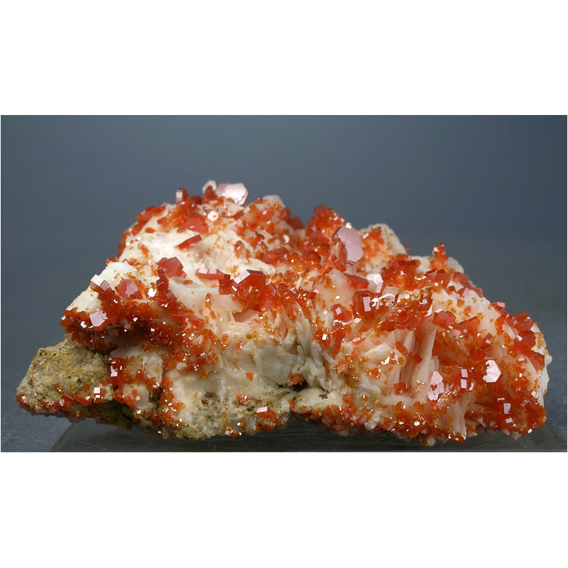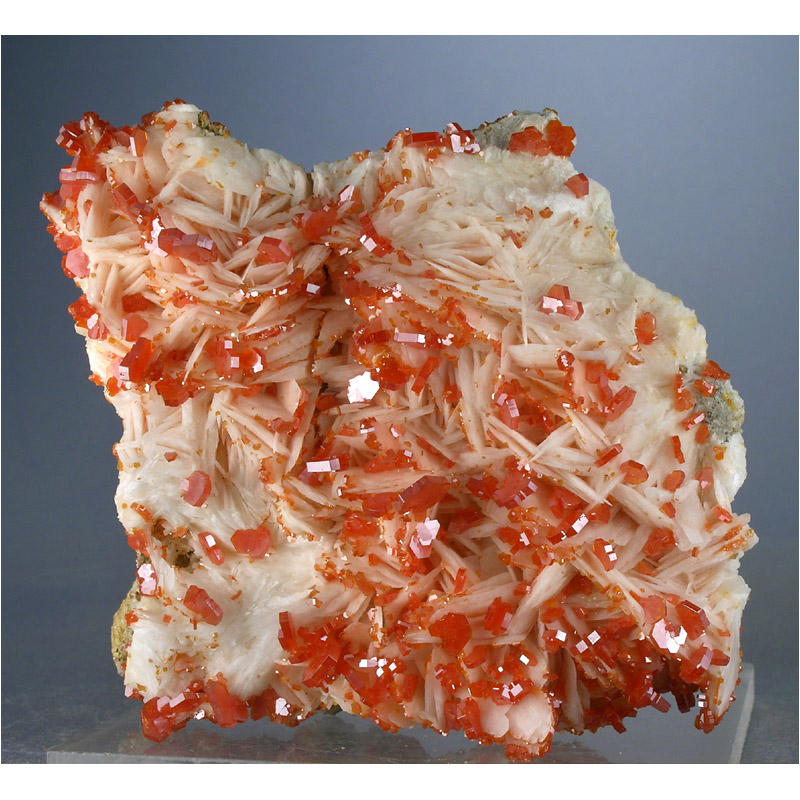 A gracefully composed and quite colorful SELF-STANDING specimen of lustrous, candy red Vanadinite from Mibladen, Morocco. It features numerous candy red Vanadinite crystals artfully arranged over some nicely contrasting snow-white Barite crystals. Displays nicely in all of the positions shown, and in excellent condition. Despite the vertical crack, the specimen is very solid. Lots of fine details for you to explore on all sides.