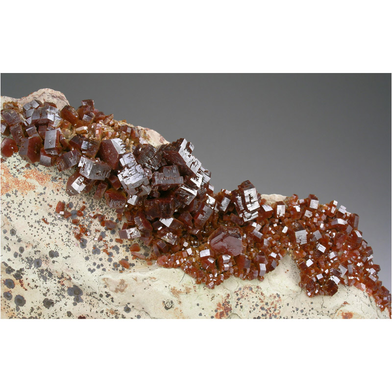 A very aesthetic specimen of lustrous, deep-red Vanadinite from Mibladen, Morocco. It features numerous super lustrous, rich red Vanadinites artfully arranged into a very graceful and aesthetic formation over a beige-colored matrix. In PRISTINE CONDITION. Wonderful contrast and absolutely luxurious color in a perfectly-balanced composition.